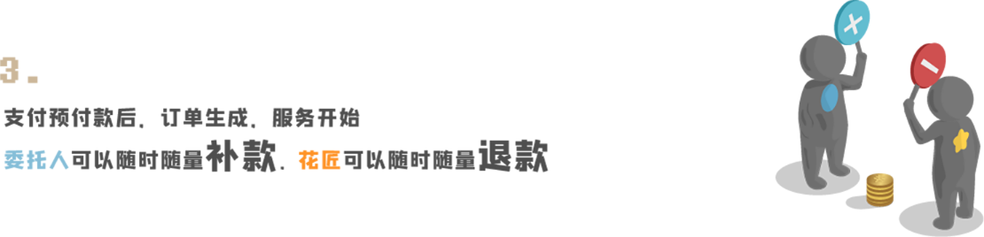 发布需求--花匠应邀--双方互选--支付定金--自由定价--完成服务
